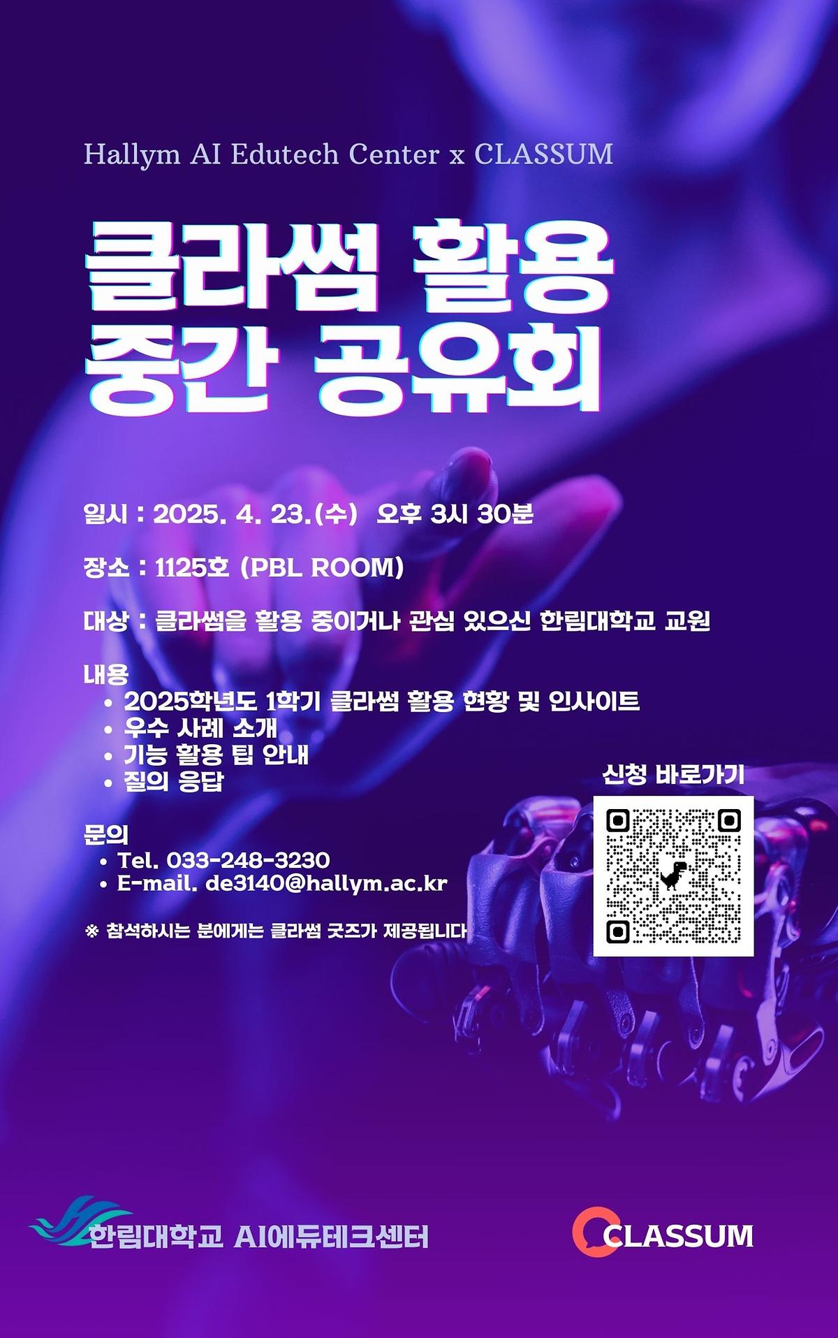한림대학교 내에서 클라썸이 어떻게 활용되고 있는지를 함께 점검하고, 교수님들께 유익한 인사이트를 드리고자 아래와 같은 자리를 마련했습니다.
