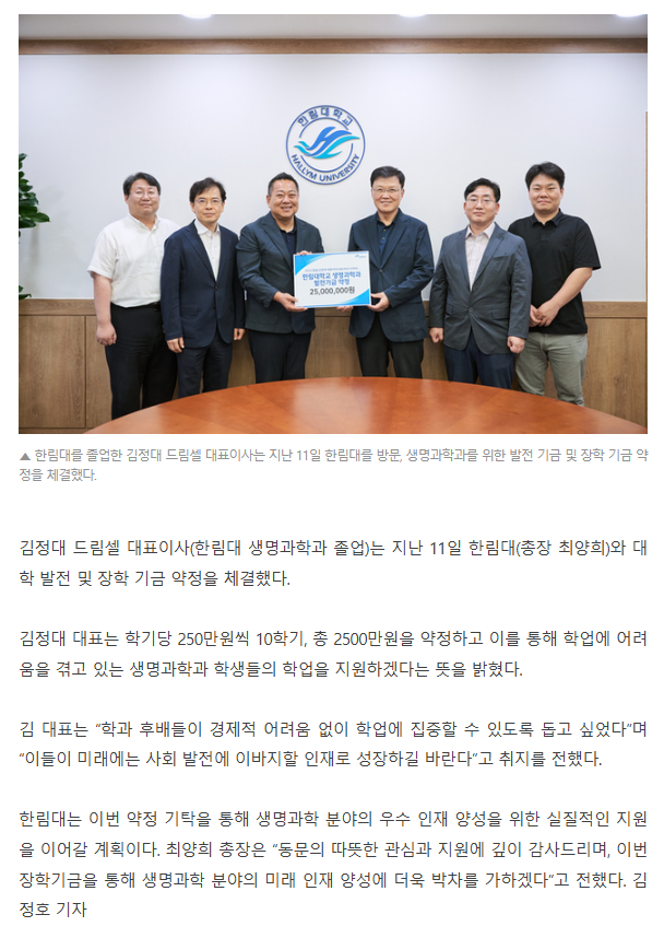 김정대 드림셀 대표, 한림대 생명과학과에 2500만원 장학기금 약정