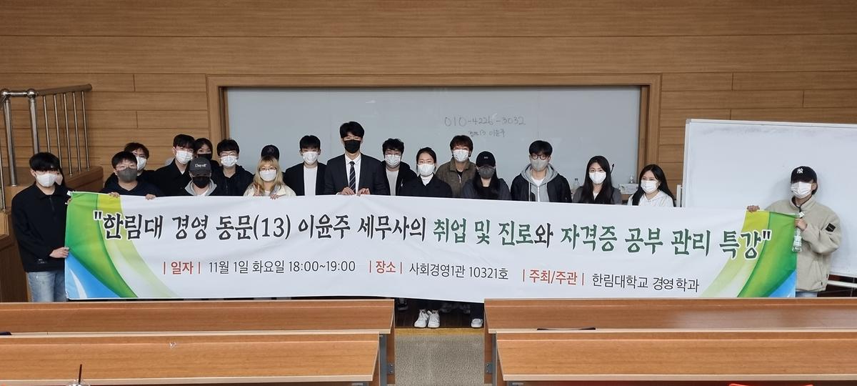 본 특강에서는 한림대 경영 동문(13) 이윤주 세무사가 '취업 및 진로와 자격증 공부관리 특강'이라는 주제로 강의를 진행했습니다.