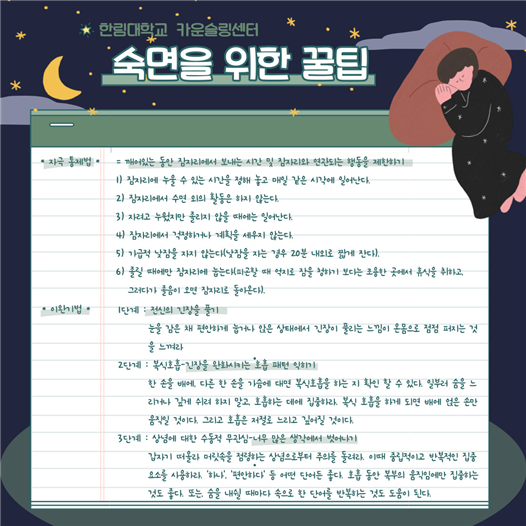 카운슬링센터 외에 도움을 받을 수 있는 정신건강 관련 기관과 스트레스를 다루는 방법과 숙면을 위한 가이드를 보내니, 아래 내용을 참고하여 즐겁고 의미 있는 여름 방학을 보내기 바랍니다.