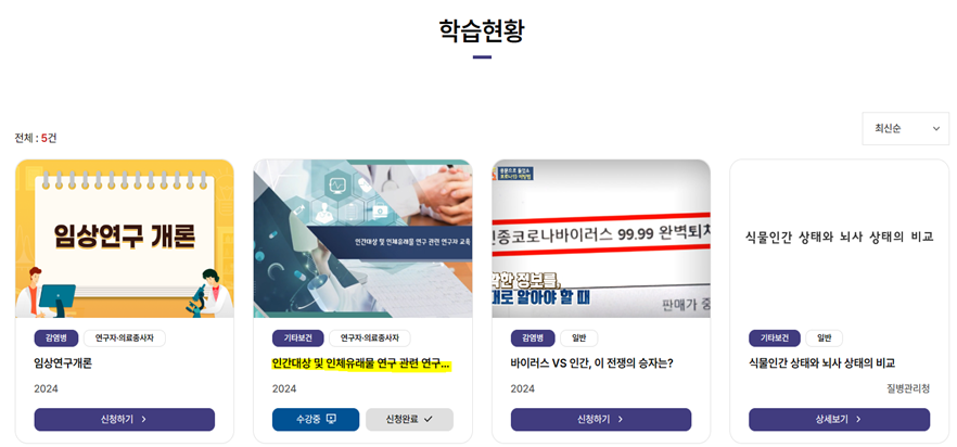 ※본교 생명윤리위원회 심의신청일 기준 2년 이내 생명윤리교육을 이수한 연구자만 심의신청이 능합니다.