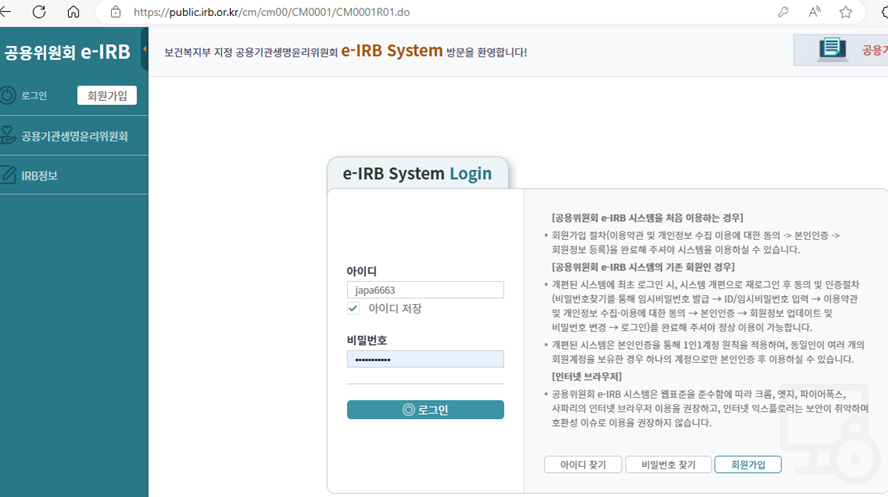 ①공용 e-IRB 로그인 (https://public.irb.or.kr/index.do)
