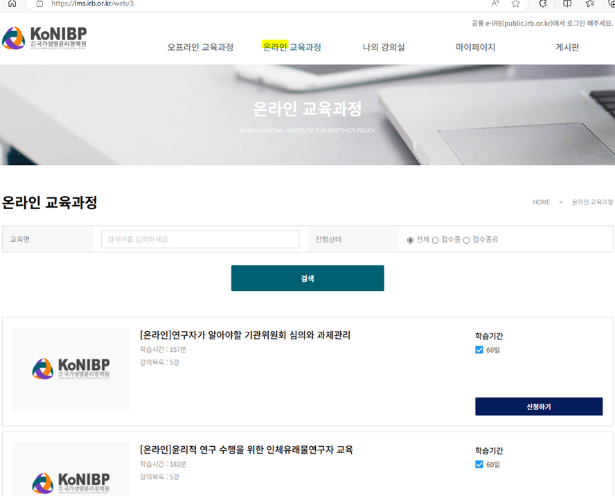 ②국가생명윤리정책원 “온라인 교육과정” 클릭 (https://www.nibp.kr/xe/irb)
