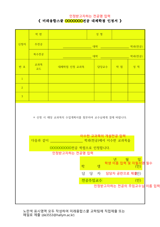 코드쉐어링 해당인지, 대체학점 해당인지 교과과정 필히 확인 후 제출 바랍니다.