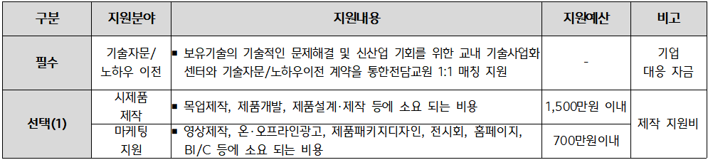 - 기술사업화를 위한 기술자문/노하우이전 및 시제품 제작, 마케팅 지원