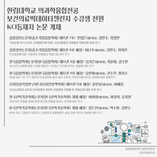 □ 의과학융합전공의 데이터분석 교육과정 중 하나인 ‘보건의료빅데이터챌린지’ (담당교수: 이종석, 정득) 수강 학부생 20명은 총 7개 팀을 구성하여 국민건강영양조사 등 보건의료 빅데이터를 기반으로 연구주제를 선정하고, 데이터 설계 및 분석을 통해 학술논문으로 결과를 도출하는 전 과정을 수행하였다.