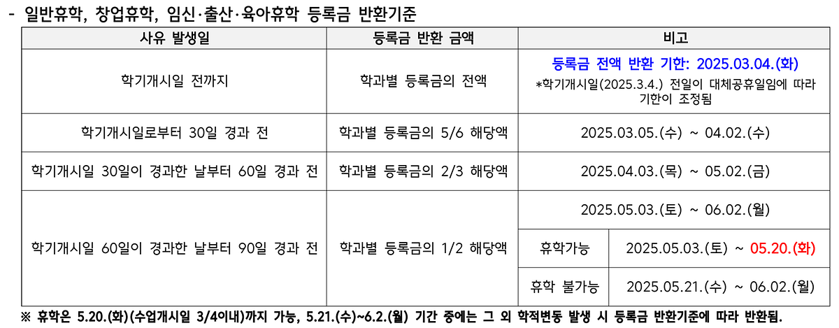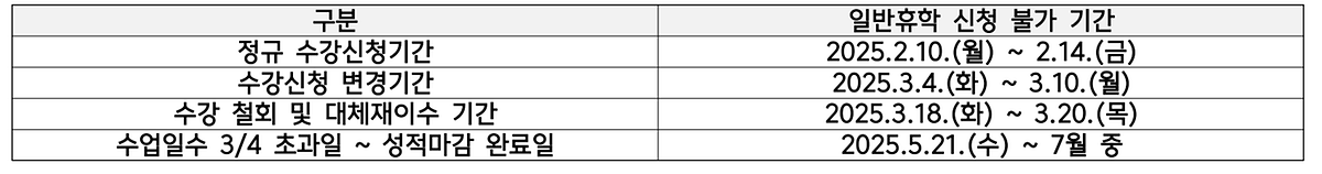 - 일반·창업·임신·출산· 육아휴학 접수 기간 : ~ 2025.05.20.(화)까지 (수업일수 ¾ 이내)
