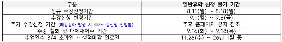 - 정규 수강신청기간: 2025.8.11.(월) ~ 8.18.(월) 오후 5시 (학년별 신청기간 상이, 홈페이지 공지 참조)