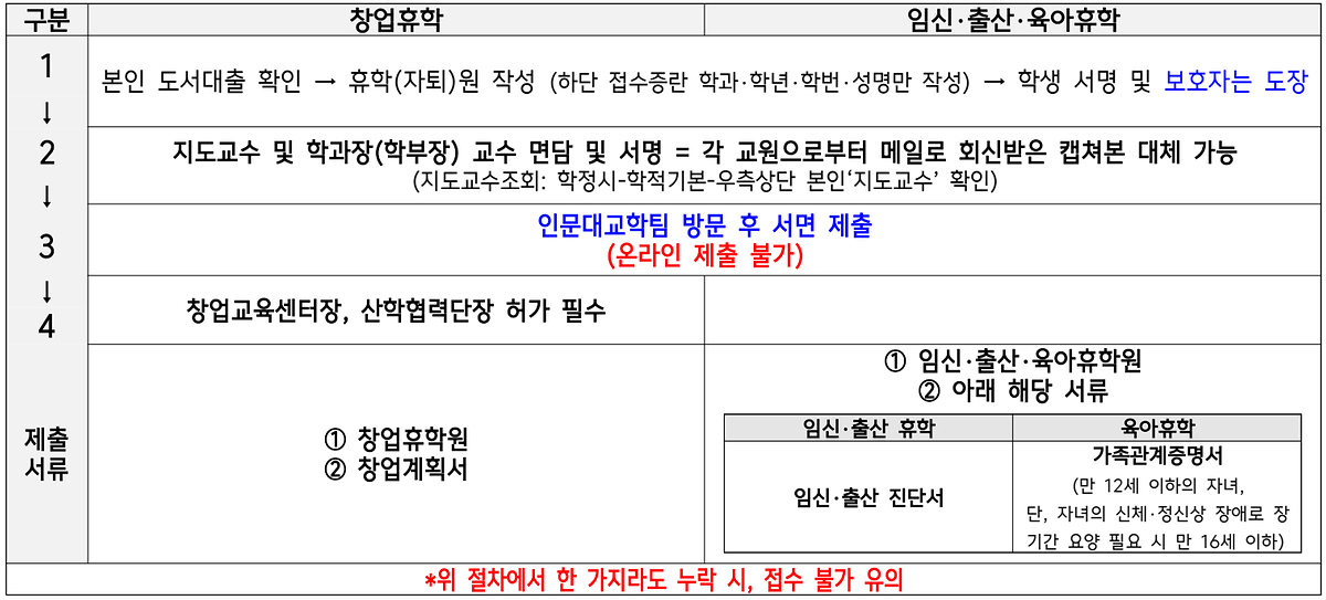 - 복학기간 내 복학할 경우: 별도 서류제출 없이 위 기간에 수강신청 완료하면 개강 시 학적상태 재학으로 변경