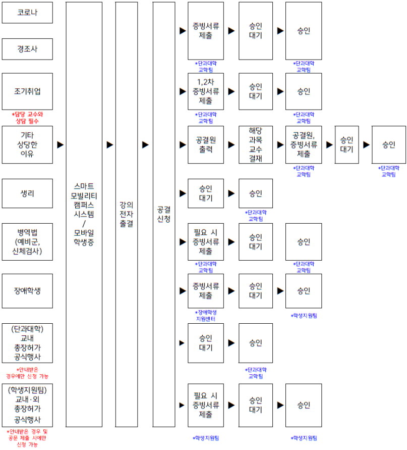 ※ 기한 내 미신청증빙서류 미제출 및 공결 사유 오류로 인한 불이익에 대한 책임은 학생 본인에게 있음.