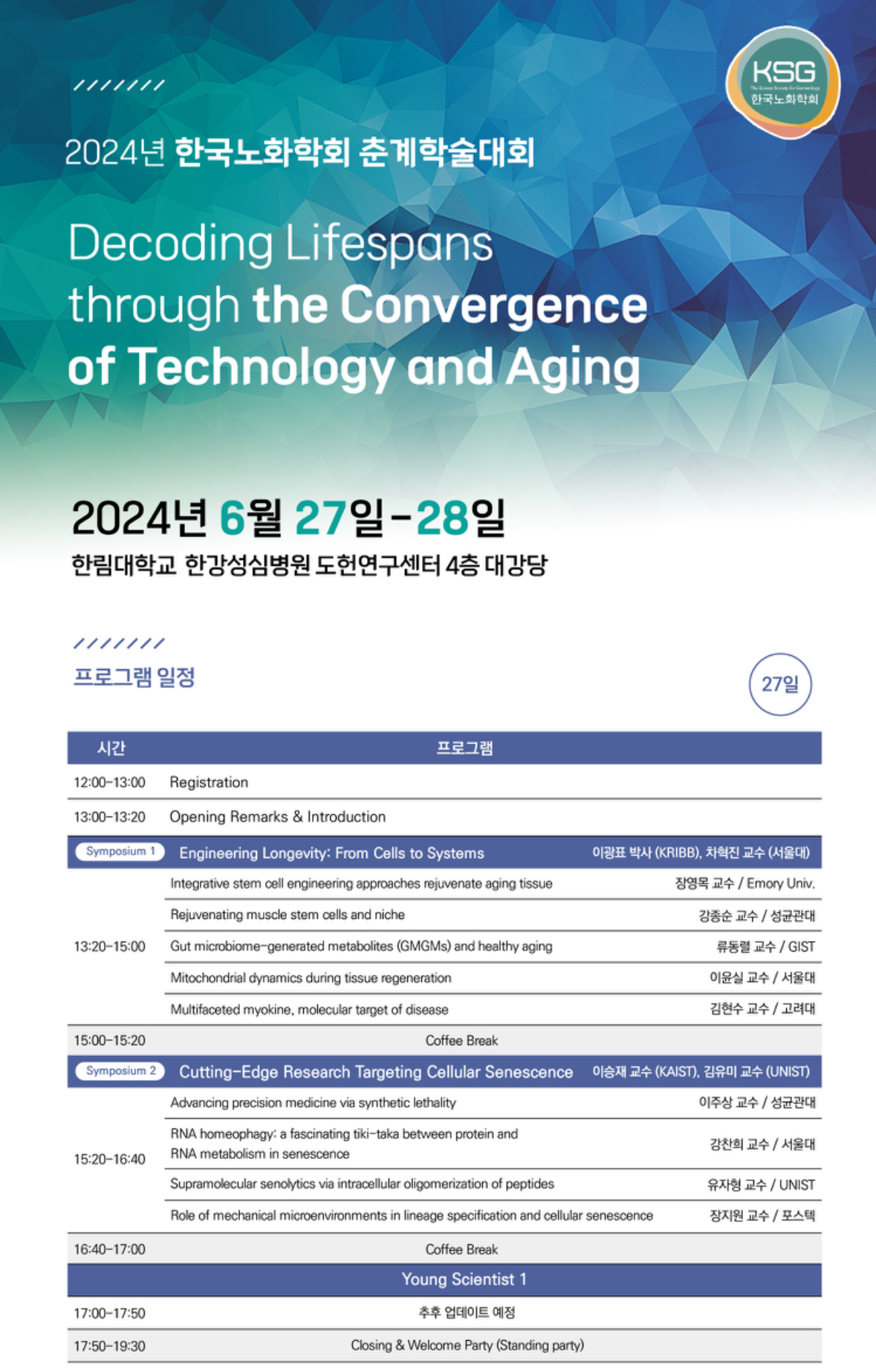 2024년도 한국노화학회 춘계학술대회가 6월 27일(목)~28일(금) 양일간 한림대학교 일송생명과학연구소가 위치한 한강성심병원 도헌연구센터 4층 대강당에서 개최될 예정입니다.