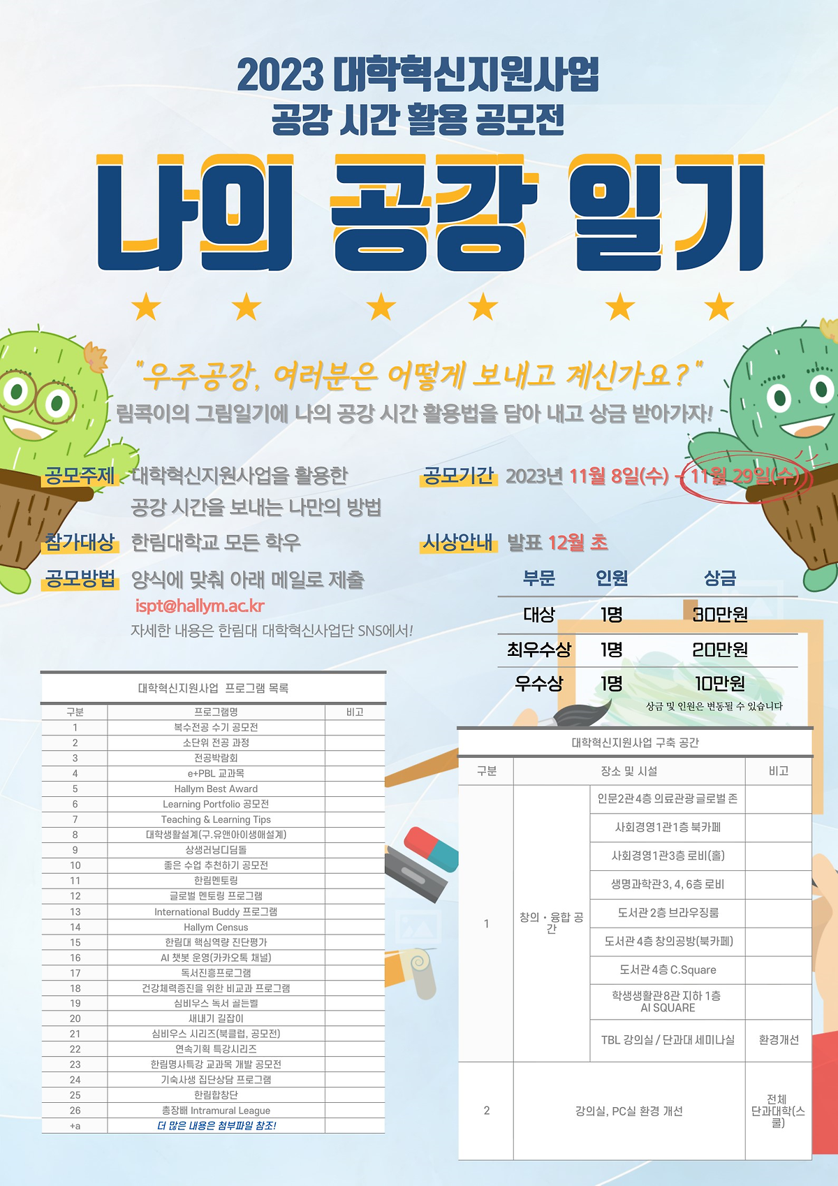 한림대학교 대학혁신사업단에서는 대학혁신지원사업과 함께하는 공강 시간 활용법을 공유해보는 「나의 공강 일기」공모전을 개최합니다.