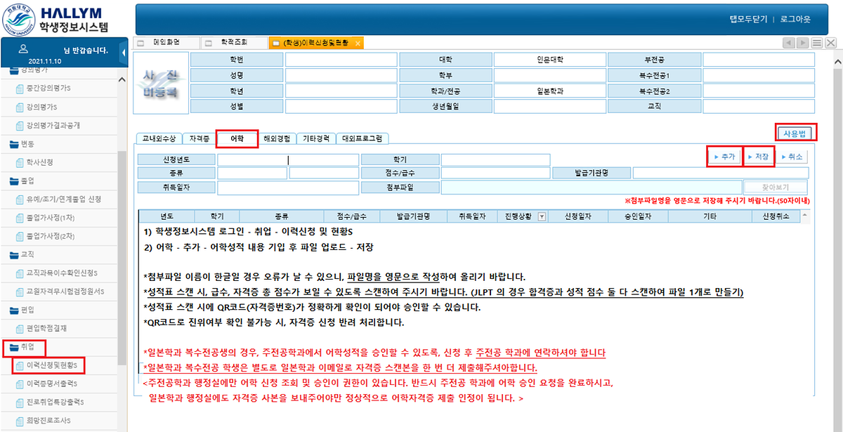 2) 어학 - 추가 - 어학성적 내용 기입 후 파일 업로드 - 저장