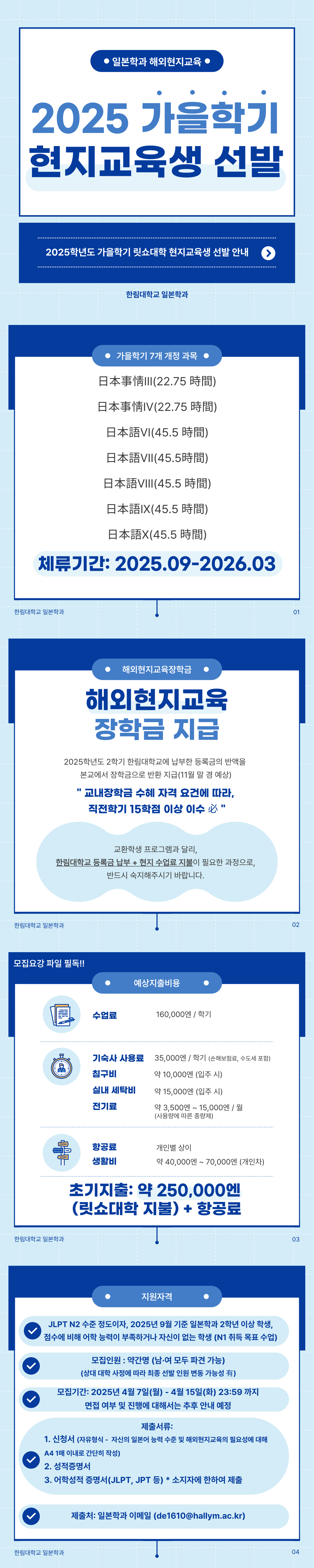 * 해외현지장학금 : 2025년 2학기 한림대에 납부한등록금의 반액을 본교에서 장학금으로 반환 지급 (5월 말 경 예상)