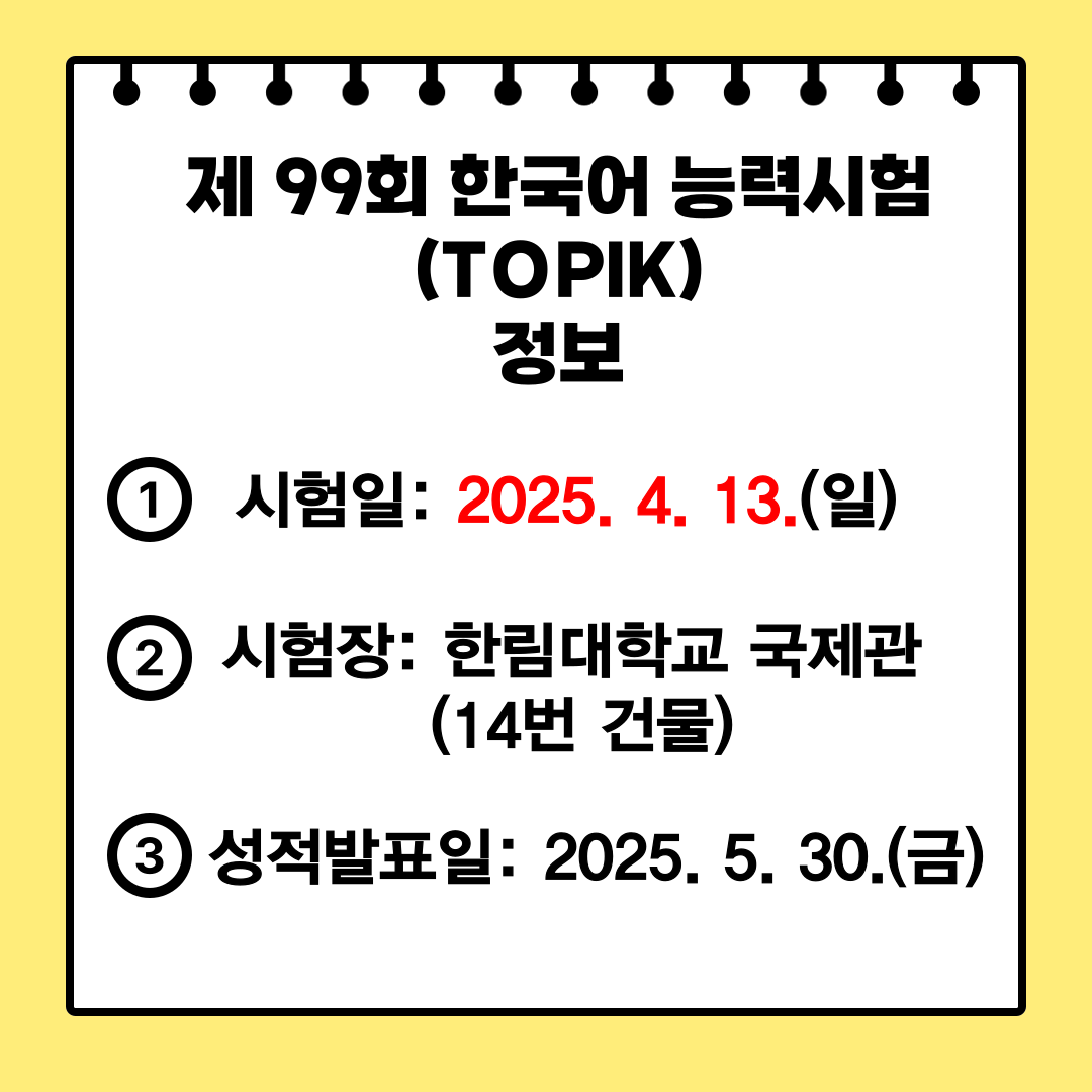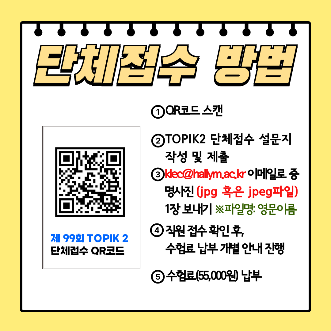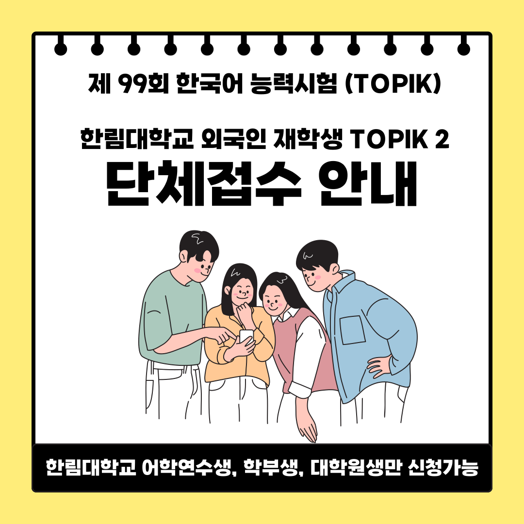 제99회 한국어능력시험(TOPIK) 단체접수 시행일정을 안내드리오니 참고하여 신청해주시기 바랍니다.