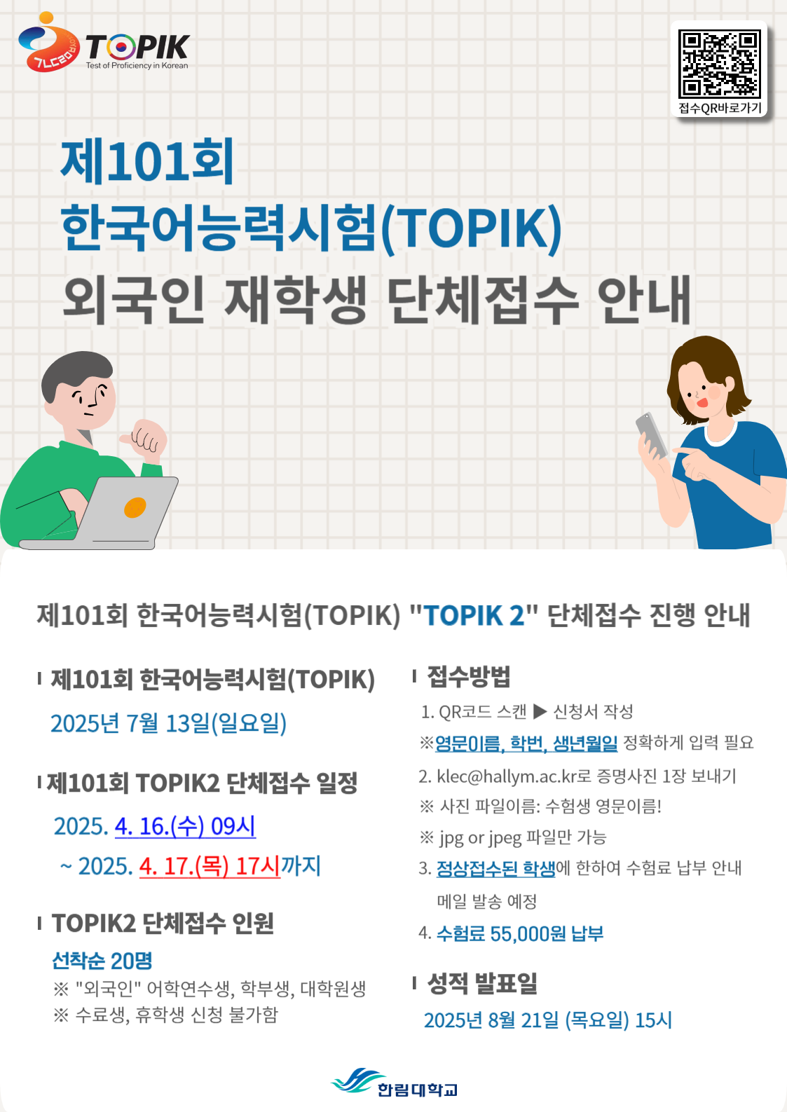 제101회 한국어능력시험(TOPIK) 한림대학교 외국인 재학생 단체접수 일정을 안내드리고자 합니다.