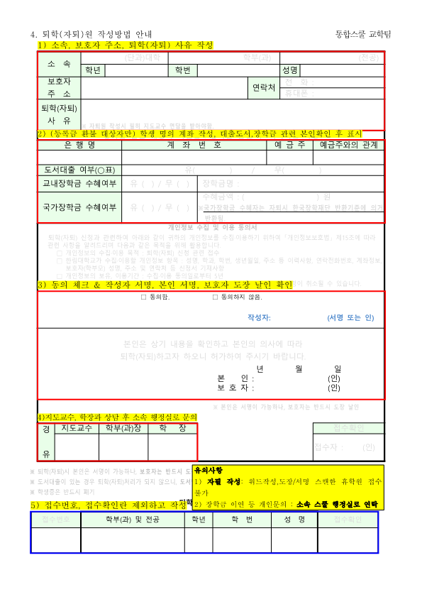 2. 신청서식: 자퇴원 1부(본인서명 + 부모님 도장 날인)