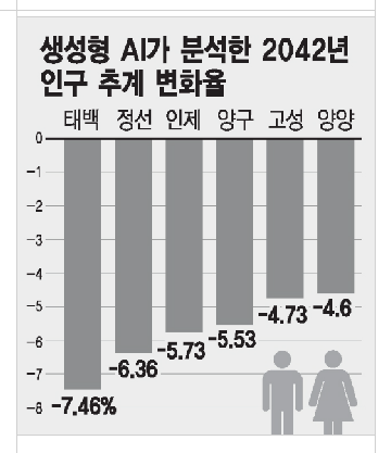 생성형 AI는 2042년 강원특별자치도의 인구 감소가 더욱 악화될 것으로 분석했다. 2022년 인구 지표를 기준으로 산출된 기관 발표와 비교해 가장 최근의 2024년 인구 지표를 대입할 경우 2042년 인구 전망은 18개 시·군 전체가 마이너스 변화율을 보인다.