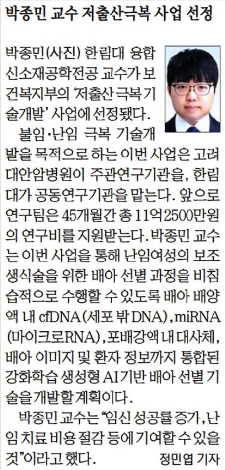 한림대학교 (총장 최양희) 융합신소재공학전공 박종민 교수가 보건복지부 주관 2025년도 제1차 보건의료기술 연구개발사업 중 ‘저출산 극복 기술개발’ 사업에 선정됐다.
