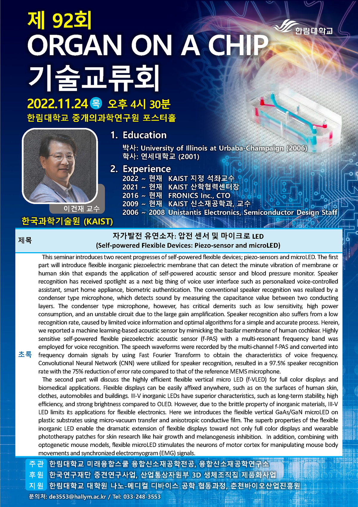 이번 기술교류회는 KAIST 이건재 교수를 연사로 모시고 '자가발전 유연소자: 압전 센서 및 마이크로 LED' 를 주제로 강연이 진행되었다.