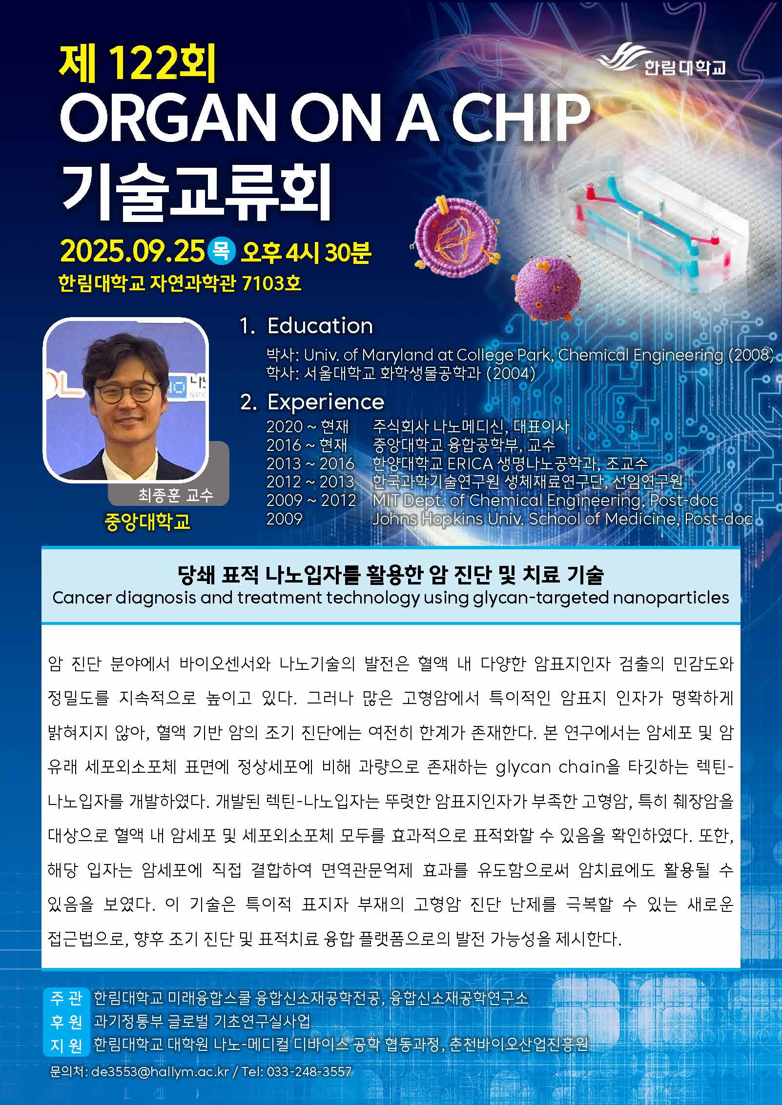 이번 기술교류회에서는 중앙대 최종훈 교수를 연사로 모시고 '당쇄 표적 나노입자를 활용한 암 진단 및 치료 기술' 을 주제로 강연이 진행되었다.