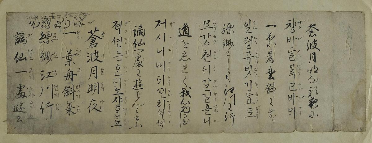 박물관에서 소장하고 있는 조선어역해문은 한시(漢詩)의 구절과 이에 대한 일본어 해석, 한글 해석을 번갈아 쓰고 이를 비교하여 익힐 수 있도록 작은 글씨로 가타카나를 표기한 문서입니다. 이를 통해 당시 일본 사람들이 조선어를 익히는 방법에 대해 살펴볼 수 있습니다.
