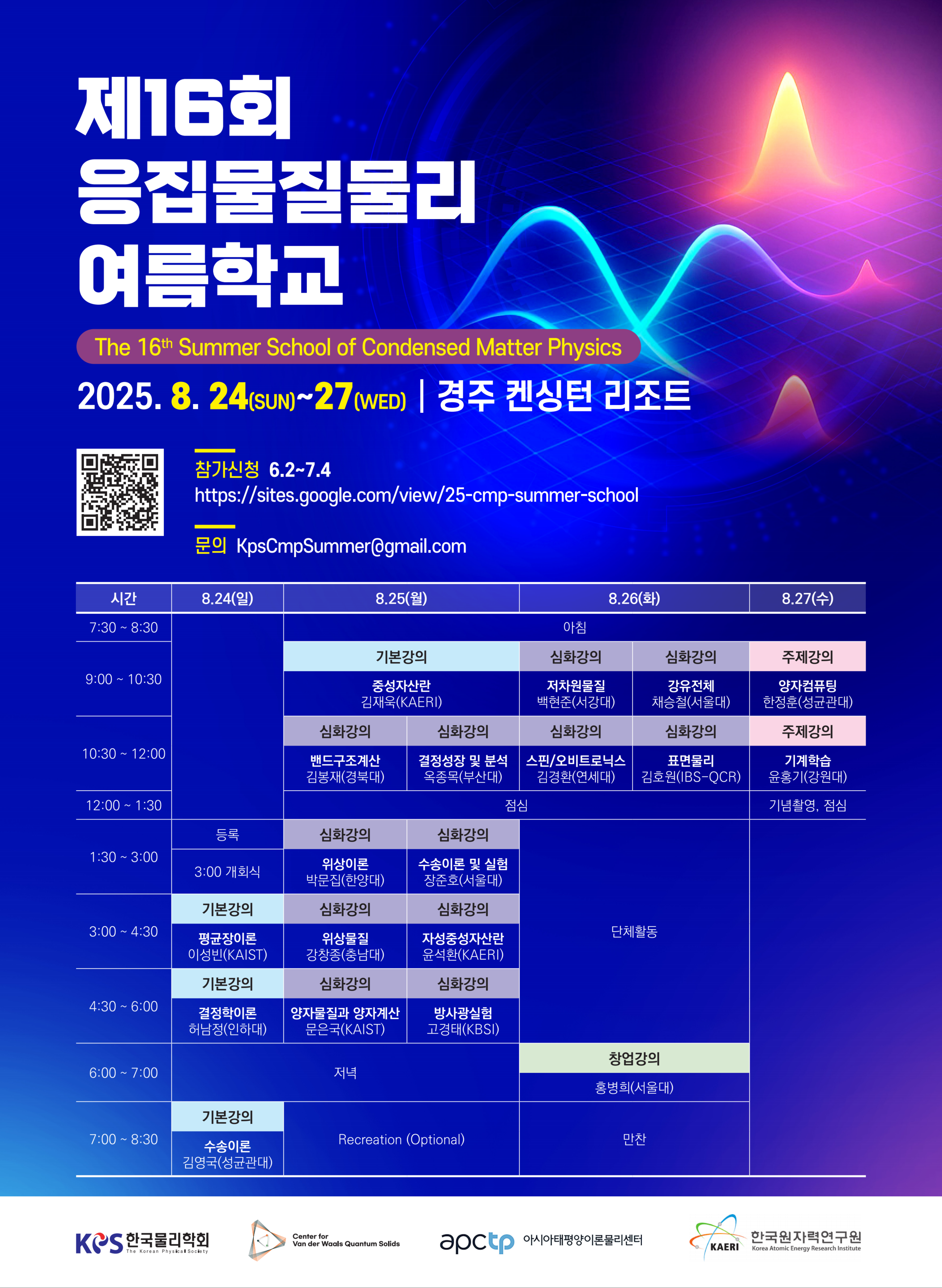 제16회 응집물질물리 여름학교 (08/24-27) 수강신청 안내