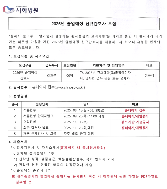 [시화병원] 2026년 졸업예정 신규간호사를 모집공고