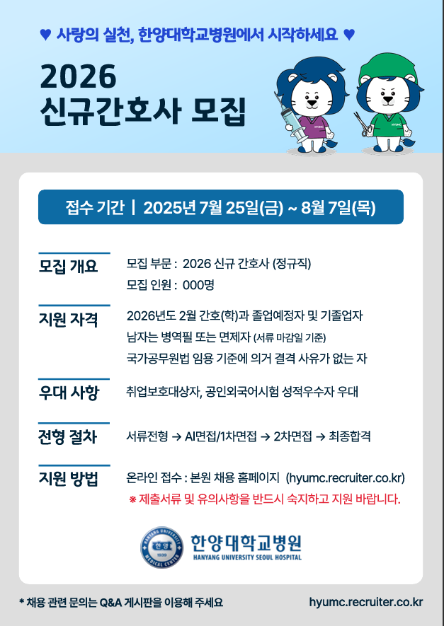 한양대학교병원 2026 신규간호사 모집 홍보드립니다.