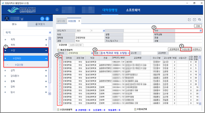통합정보시스템 로그인▶대학원행정▶수강▶수강처리▶수강신청