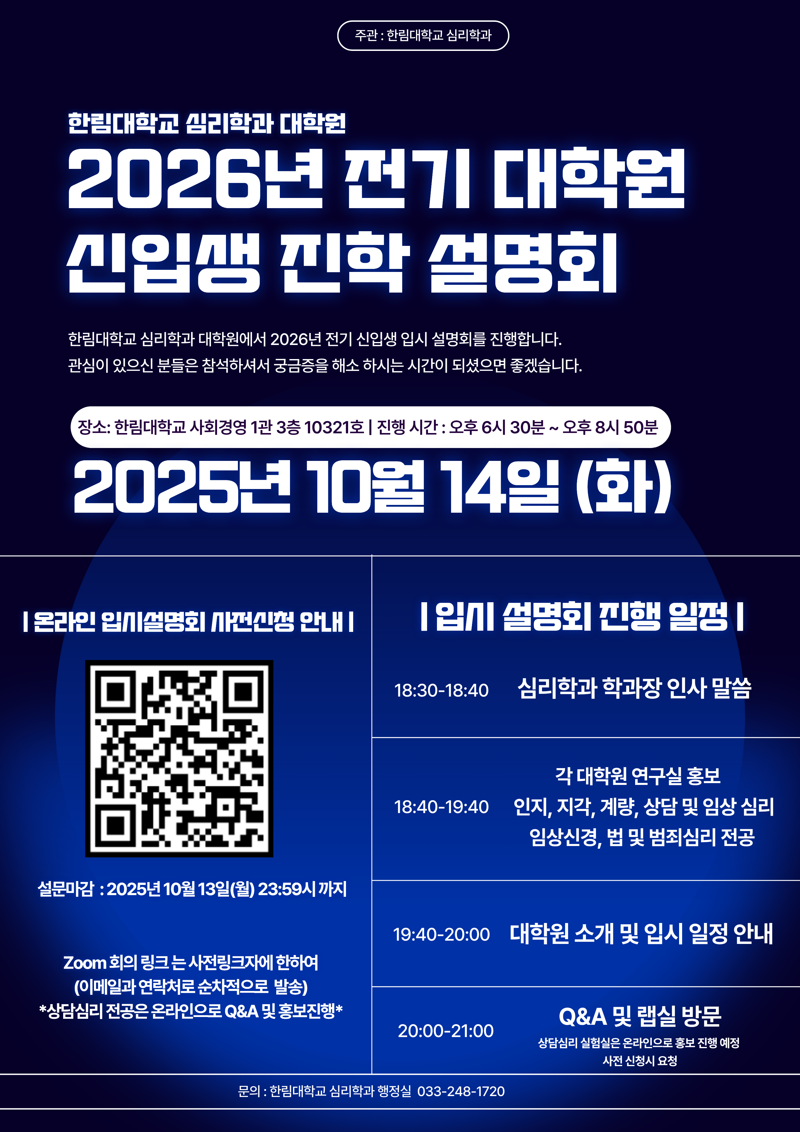 2025.10.14 (화) 오후 18시 30분 - 21시 : 한림대학교 심리학과 대학원 2026년 전기 대학원 신입생 진학 설명회