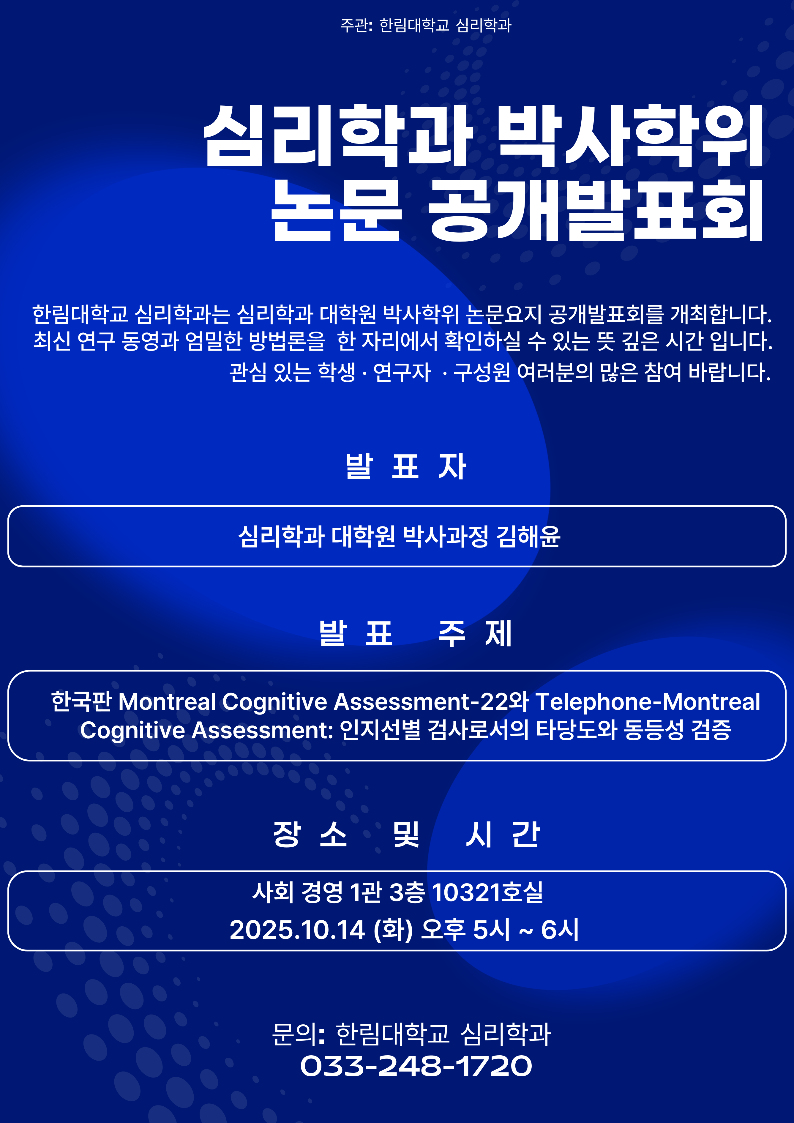 2025.10.14 (화) 오후 17시 - 18시 : 심리학과 박사학위 논문 공개발표회