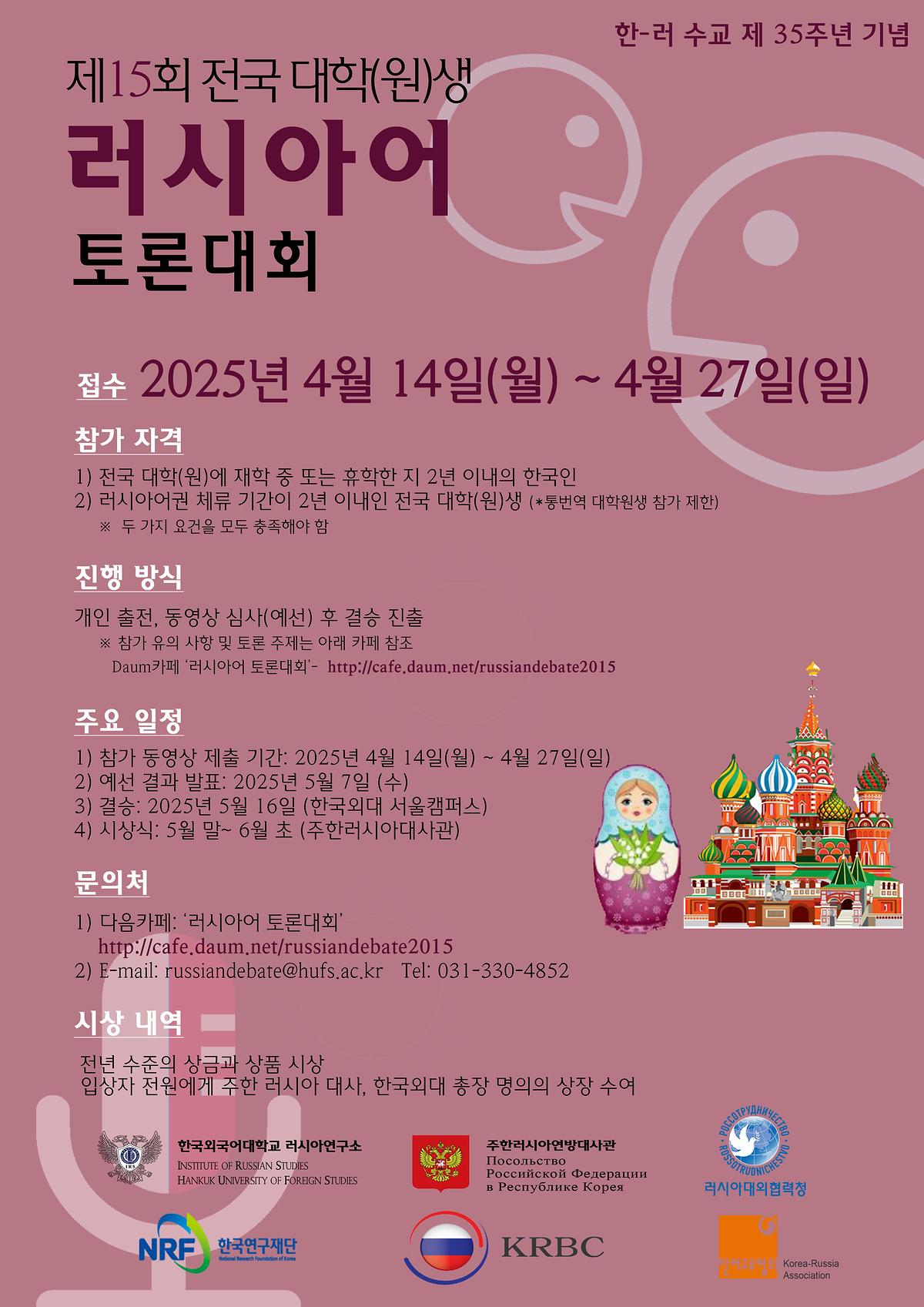 제15회 전국 대학(원)생 러시아어 토론대회가 개체 될 예정입니다.
