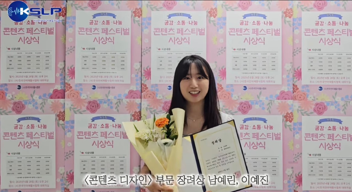 한림대학교 언어청각학부 언어병리학전공 남예린, 이예진 학생이 (사)한국언어재활사협회 제5회 공감·소통·나눔페스티벌 콘텐츠디자인 부문에서 장려상을 수상했습니다.