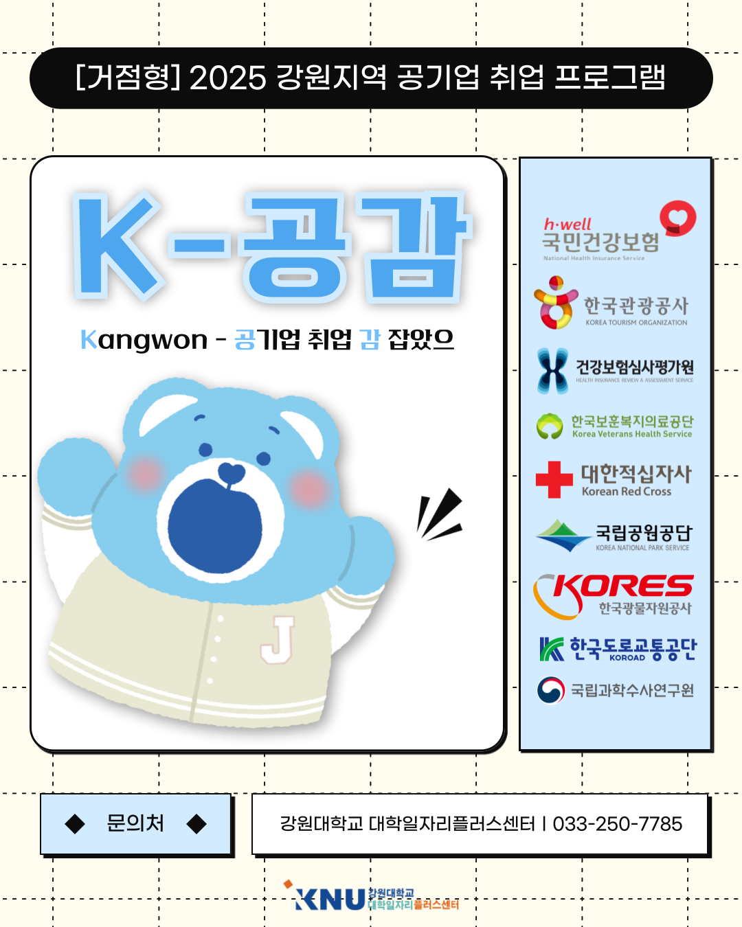 강원대학교 대학일자리플러스센터는 강원 지역특성 기반의 거점형 특화 프로그램인 '2025 강원지역 공기업 취업 프로그램 「K-공감」'을 운영합니다.