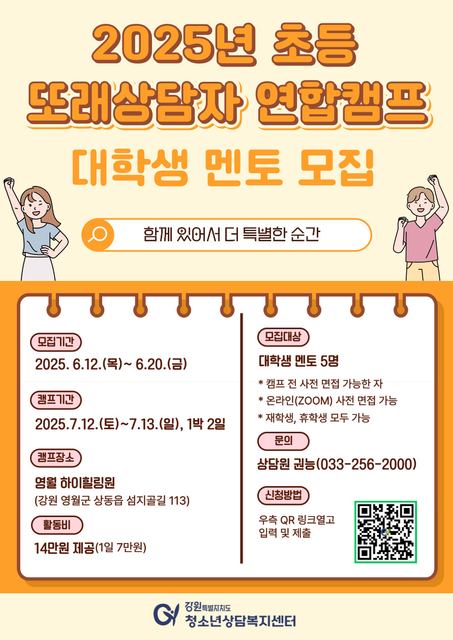 [강원특별자치도청소년상담복지센터] 2025년 또래상담자 연합캠프(초등) 대학생 멘토 모집 안내문 및 포스터 안내