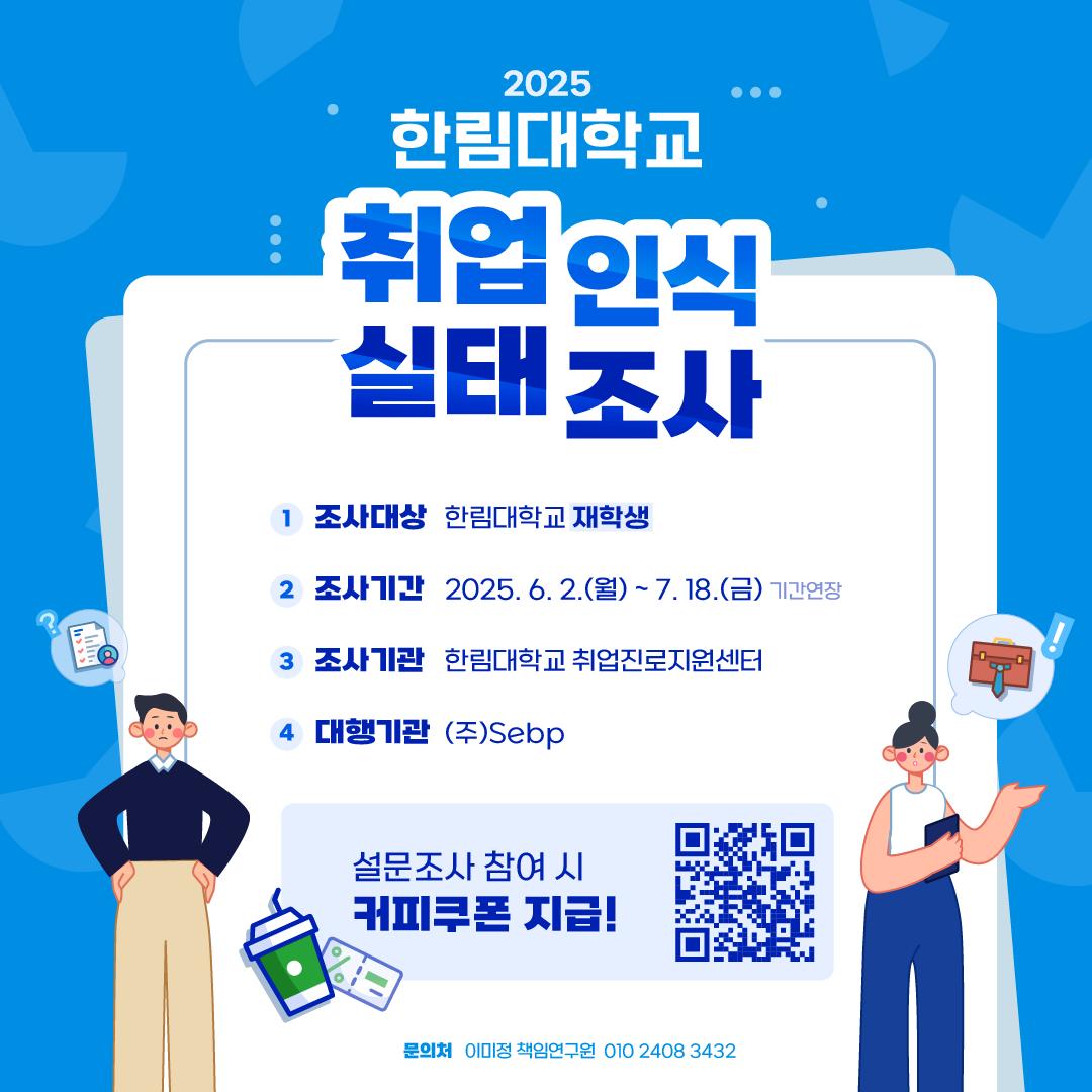 안녕하세요? 취업진로지원센터입니다.우리대학 취업인식률을 알아보기 위해, 취업인식 실태조사를 시행중에 있습니다!참가시 커피쿠폰을 지급해드리고 있으니, 많은 관심과 참여 부탁드립니다.재학생 설문 참가 링크: https://moaform.com/q/sOFG2K재학생 뿐만 아니라, 졸업생 여러분들을 대상으로도 조사를 진행중이오니, 많은 참여 부탁드립니다.졸업생 설문 참가 링크: https://moaform.com/q/OhVzRK