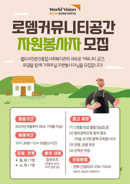 월드비전춘천종합사회복지관에서 커뮤니티공간관리 자원봉사자 모집합니다. 많은 지원바랍니다.