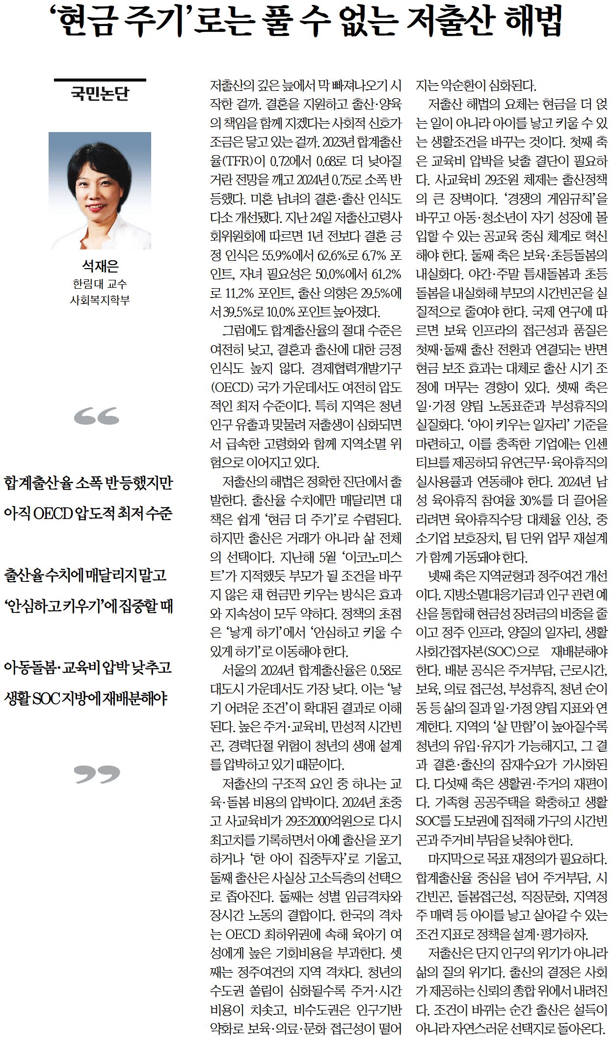 [국민논단] ‘현금 주기’로는 풀 수 없는 저출산 해법