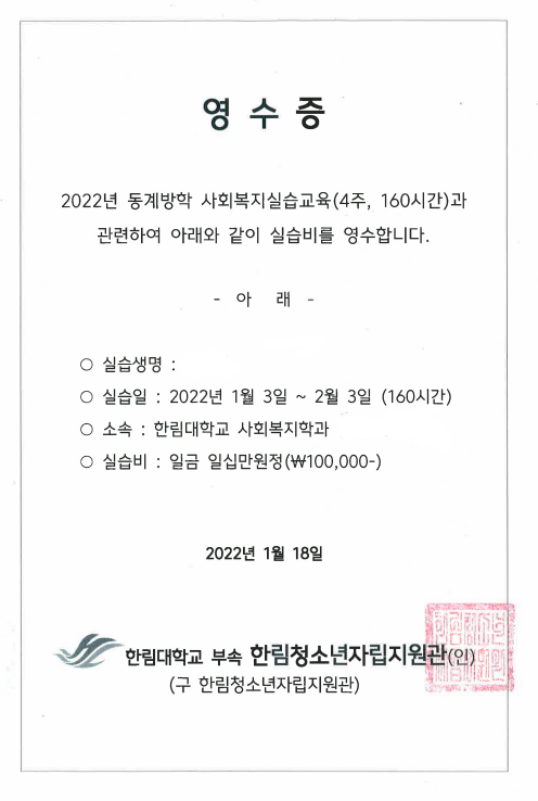 사진처럼 실습생 이름, 실습일, 실습비, 실습기관, 도장이 있는 양식이면 됩니다