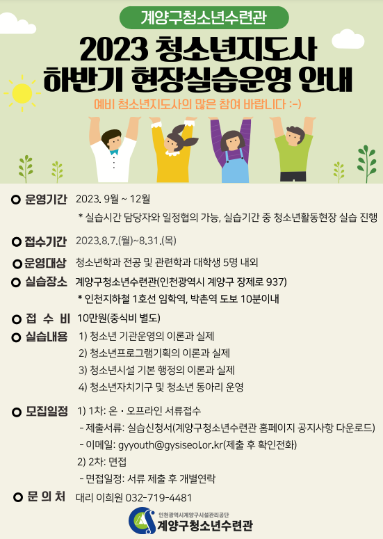 계양구청소년수련관에서는 청소년관련학과 학생들에게 현장업무 능력과 청소년활동의 이해 및 활동지도기법 습득을 기반으로 청소년활동 전문가를 양성하기 위해 현장실습을 운영하고자 합니다.