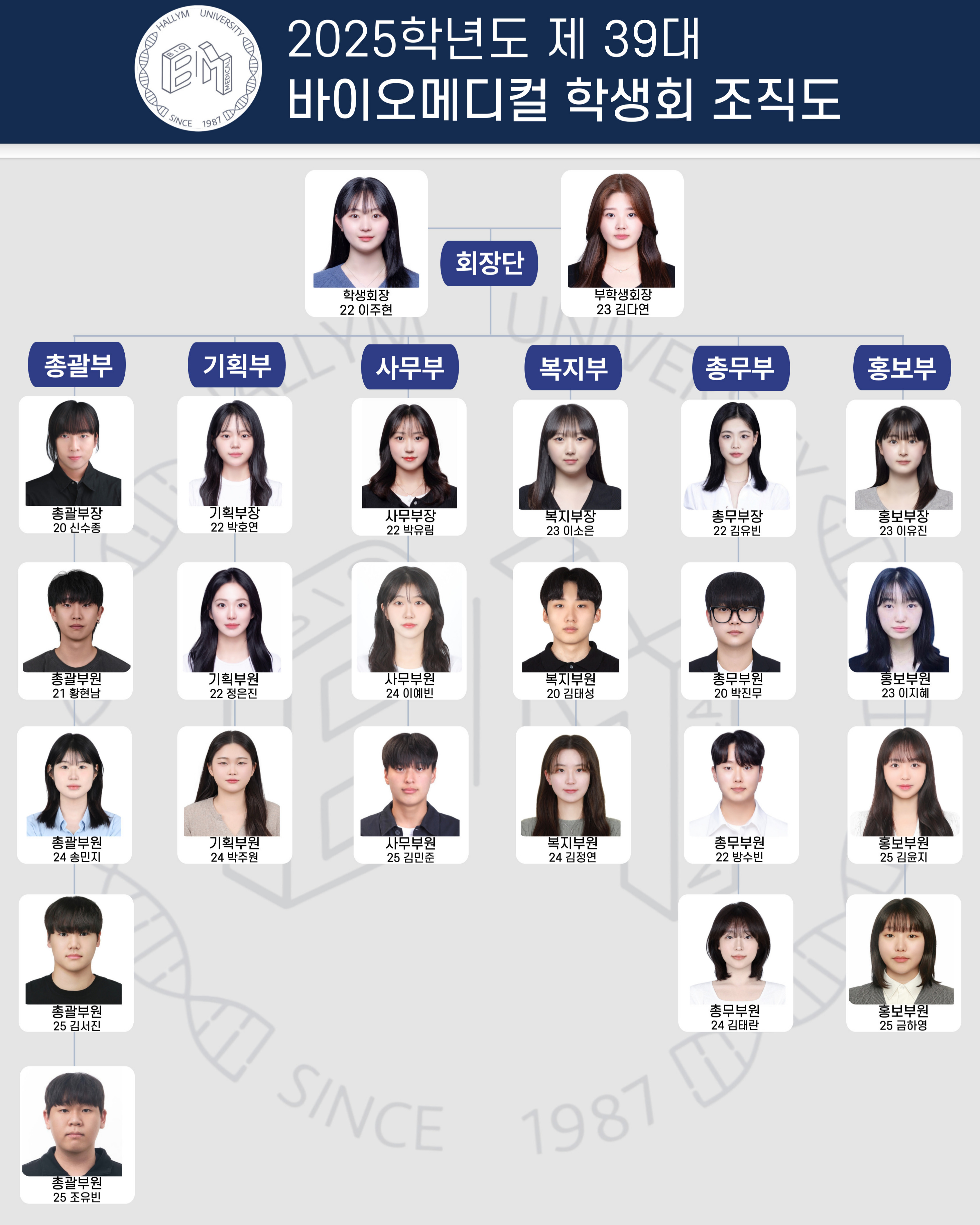 학생회의 구성은 회장단, 총무부, 기획부, 홍보부, 복지부, 동아리로 이루어져 있으며, 본회는 바이오메디컬학과 학생들의 원활한 학교생활을 위해 학업 및 취업 그리고 권익보호 와 윤택한 복지혜택, 투명한 운영을 목적으로 하고 있습니다.