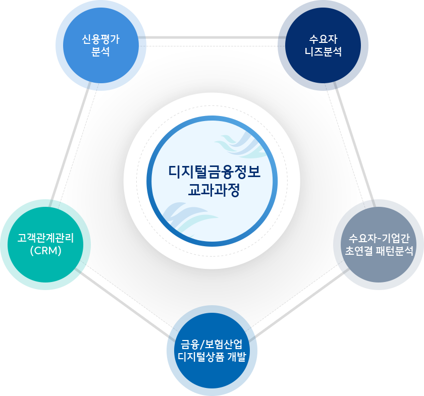 - 기업경영 및 금융보험 산업에서 생성된 기업데이터를 기반으로 새로운 동력업무를 창출하기 위한 데이터 기반 기획 및 절략 전문가 과정 (예: 수요자 니즈분석, 수요자와 기업간의 초연결(hyper-connected) 패턴 분석, 금융 및 보험 산업에서의 디지털상품 개발, 고객관계관리(CRM), 신용평가분석 등)