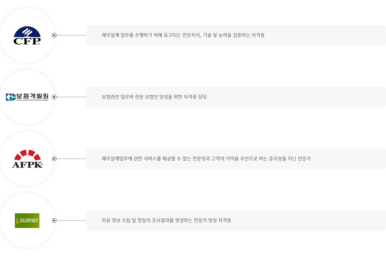재무설계 업무를 수행하기 위해 요구되는 전문지식(Knowledge), 전문기술(Skill) 및 전문능력(Ability)을 검증하는 CFP(Certified Financial Planner) 인증 프로그램은 세계적으로 가장 역사가 깊고 인지도가 높은 프로그램으로 전세계 금융 소비자에게 큰 신뢰를 제공 할 뿐 아니라 기타 재무설계사들로부터 큰 차별성과 경쟁력을 가지고 있다.