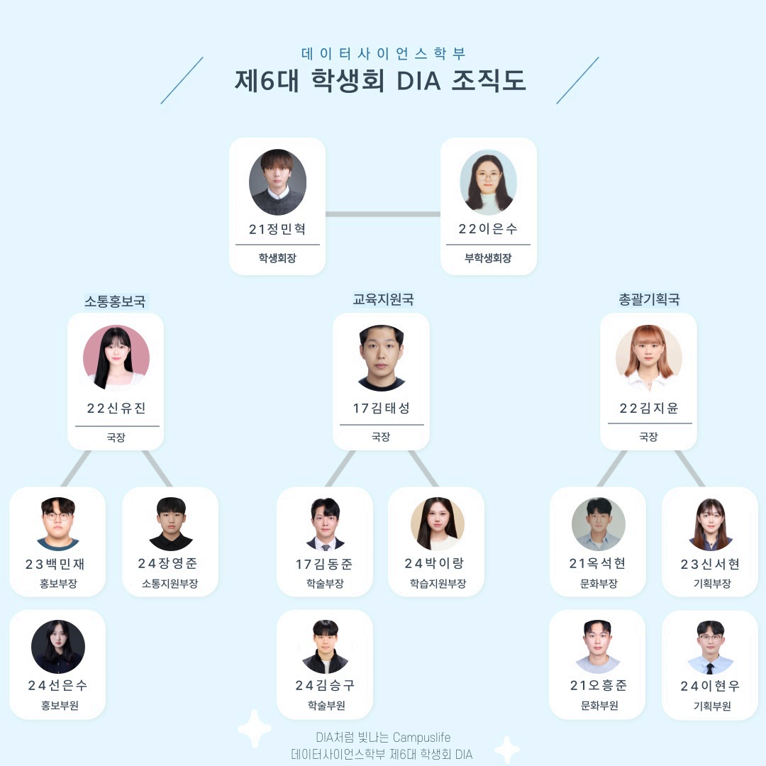 DIA의 슬로건은 ‘다이아처럼 빛나는 Campuslife’로 데이터사이언스학부 학우 분들에게 다이아처럼 빛나고 영원히 기억에 남을 대학생활을 보낼 수 있게 도와드리겠다는 의미를 담고 있습니다.