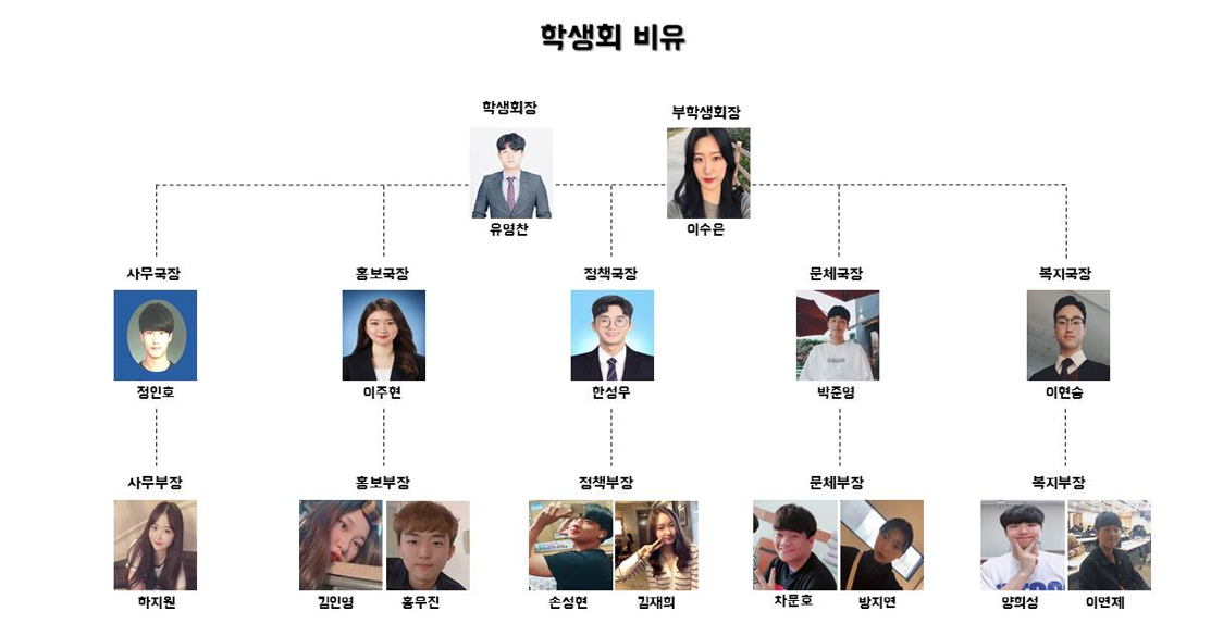 Be : U는 Behind you의 줄임말로, 학생들의 뒤에서 지켜보고 앞에서 이끌겠다는 의미입니다. 회장단과 5개의 국으로 이루어져 있으며, 총 16명으로 구성되어 있습니다. 저희 학생회가 하는 일은 신입생과 재학생간의 친목 도모와 학우들의 편의와 학업을 위한 동아리 활동, 여러 행사 및 사업들을 주관하는 것이며, 학우들의 불편사항들을 최대한 수렴하기 위해 학우들을 대표하여 지원 요청을 하고 있습니다. 대표적인 행사로는 MT, 총회, 학술제 등이 있고, 사업으로는 간식사업, 대여사업, SNS 등이 있습니다. 학과를 위해 더 많이 일하고 노력하겠습니다. 많은 관심과 참여 부탁드립니다. 감사합니다.