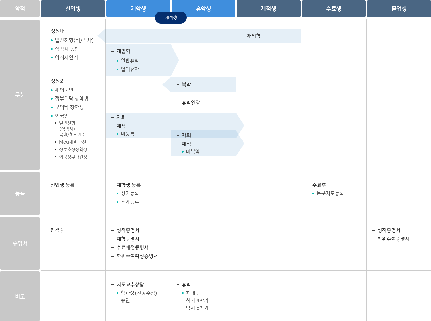 절차: 복학원(입대휴학자의 경우 전역증명서 첨부) 작성 → 학과장(지도교수) → 대학원교학팀 제출 → 대학원장 승인