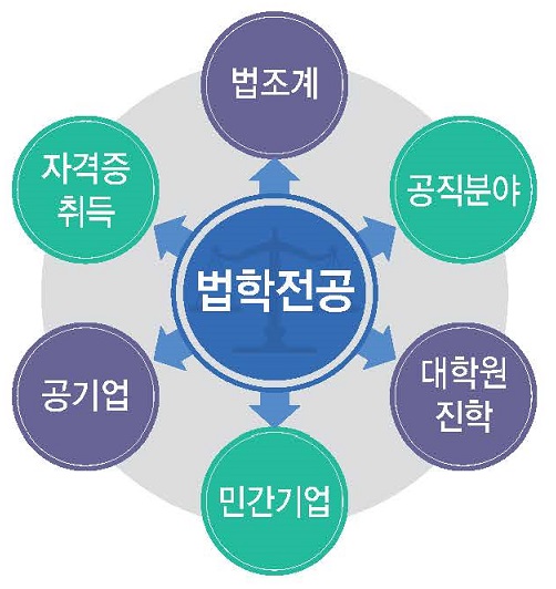 - 법학 전공자들은 대학교 교육과정 동안 법지식을 바탕으로 변호사 등 법조인 및 법무전문가들의 각종 전문적 업무를 보조하는 등 법률실무에 종사할 수 있습니다.