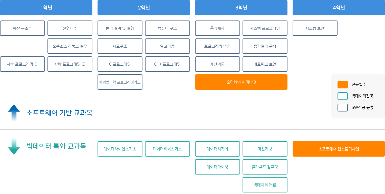 빅데이터 전공 교육과정은 대용량의 데이터를 효과적으로 저장 관리하는 방법 및 고성능으로 처리하기 위해 요구되는 교과목을 제공합니다. 또한 인공지능/기계학습을 적용한 데이터 학습과 추론을 통해 데이터를 분석하는 소프트웨어 알고리즘 관련 교과목들을 학습합니다.