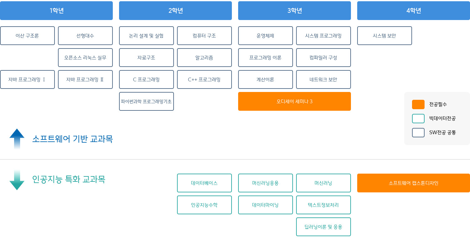 - 텍스트정보처리: 스피킹 태킹, 파싱, 의미 분석 및 기계 번역과 같은 자연어처리 요소와 텍스트기반의 정보처리에 대한 이론 및 주요 기술 학습